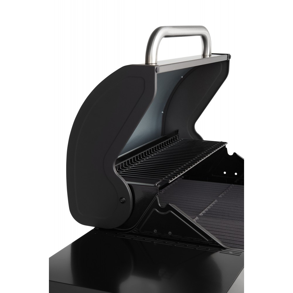 Nagyon praktikus az akasztós állvány, ahol melegen és fogyaszthatóan tarthatja a már kész ételeket.A grillsütő praktikus csukható fedél beépített hőmérővel