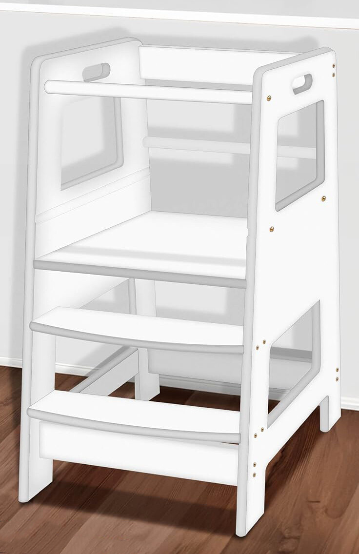 A gyermek önállóan felmászhat az oktatótornyra, a padlótól való lépcső 20 cm magasságban van, ami segít a gyermeknek biztonságosan feljutni a toronyra.A tanulótorony nemcsak a konyhában használható, hanem más tevékenységek során is, mint például a fogmosás, kézmosás, apának segíteni a műhelyben vagy a felső polcokon lévő játékok átadásában.