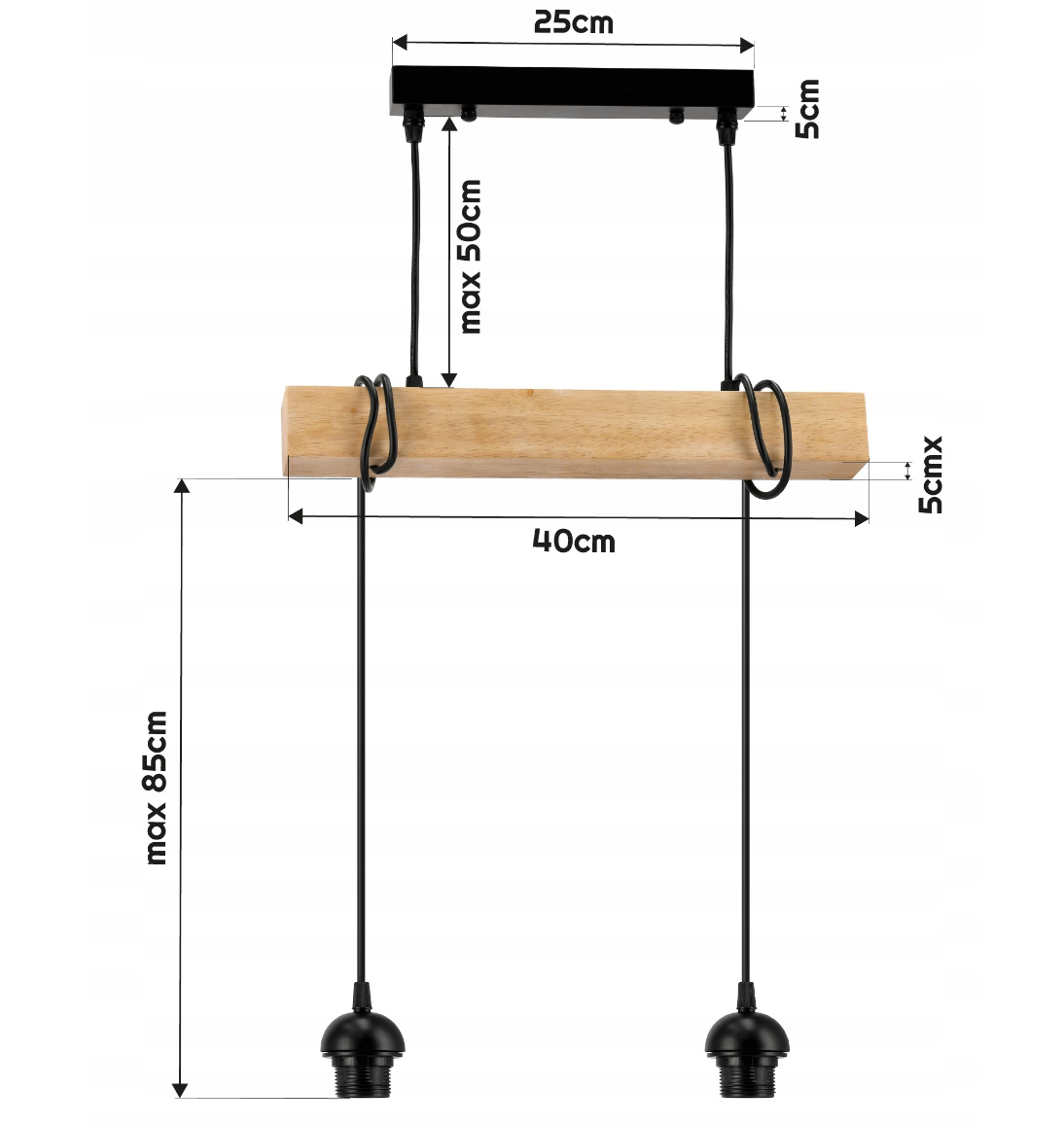 Műszaki adatok: Tápfeszültség : 230V Fényforrás : 2 x E27 (izzók nem részei a készletnek) A lámpa tartókkal rendelkezik, amelyekre lámpaernyők csavarozhatók (külön vásárolhatók meg) Alapanyag : Acél + fa Rögzítés színe : Fekete Egy fényforrás maximális teljesítménye : 60W (wolfram izzók) / 20W (LED) Tanúsítványok : CE, RoHS További jellemzők : Beépített szerelőblokk a könnyű csatlakoztatáshoz, magasságállítás kábelekkel és gerendával