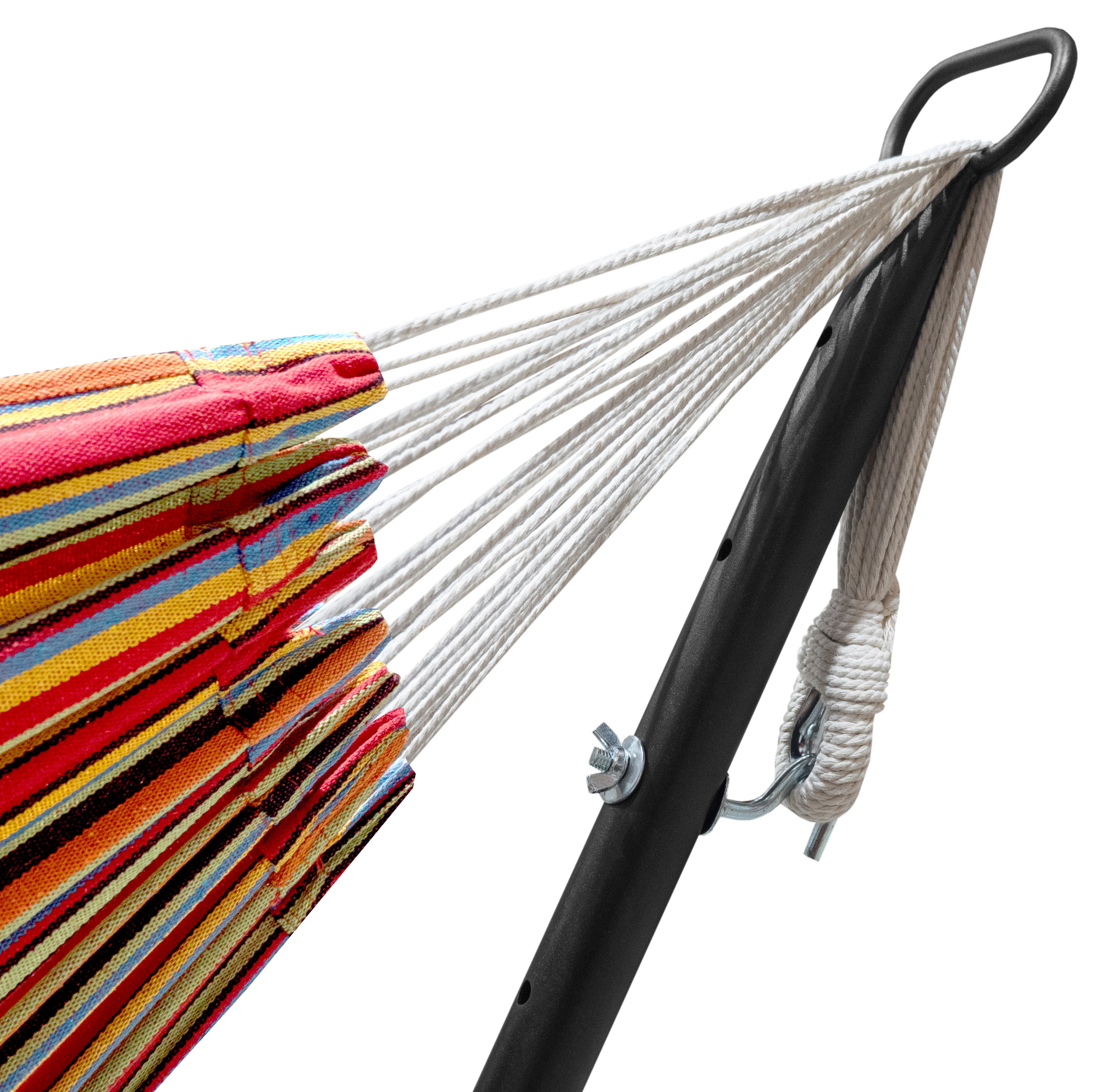 Összeszerelés tartós porszórt acélvázból, amely teherbíró szerkezetének köszönhetően különösen biztonságos állást biztosít. A kényelmes poliészter anyag nagyon kényelmessé teszi a függőágyat.A 150x200 cm-es méreteknek köszönhetően a fekvőfelület elegendő helyet kínál mindenkinek, akár ketten is. Legfeljebb 150 kg terhelhetőségig.