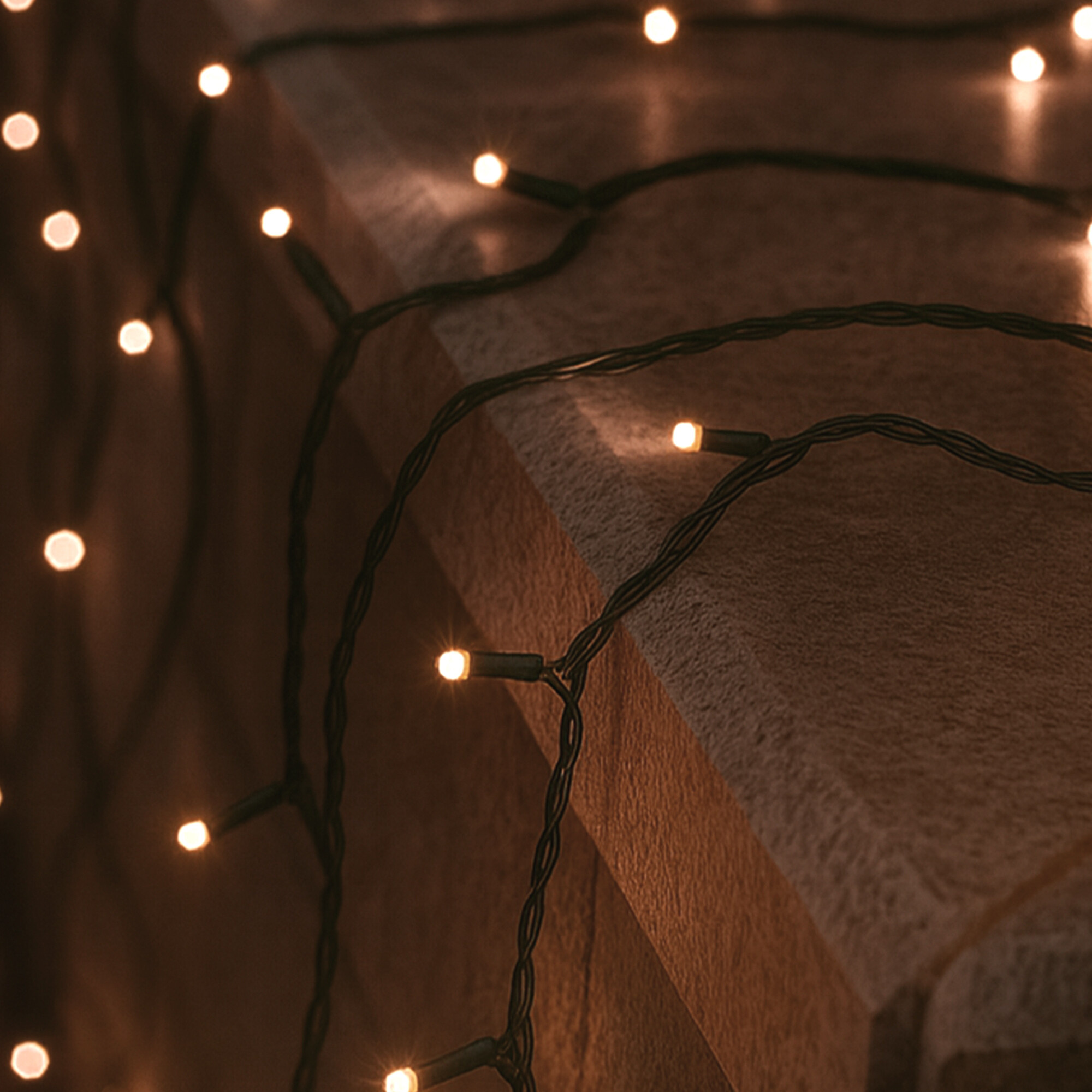 Kiváló minőségű karácsonyi LED lánc meleg fehér színben világít.