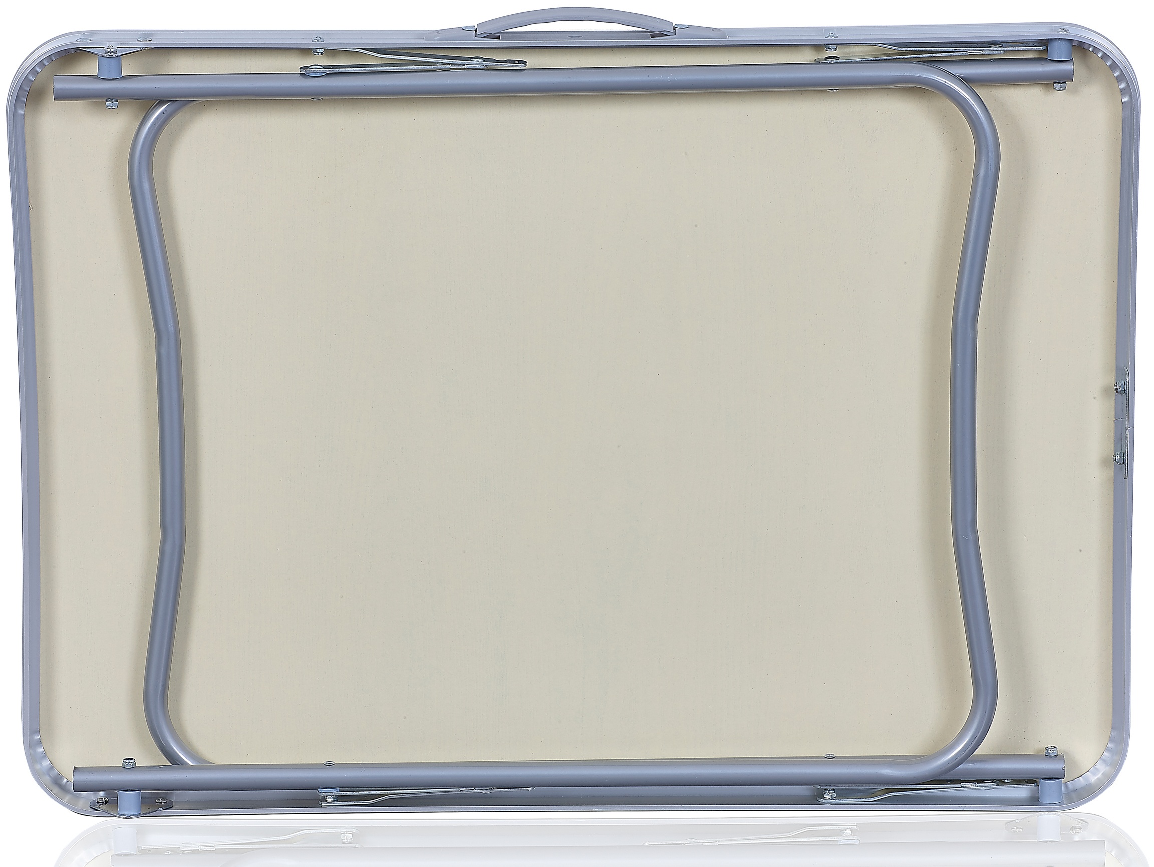 - Összecsukott állapotban az asztal könnyen szállítható, egy fogantyúval ellátott lapos tányér formájában