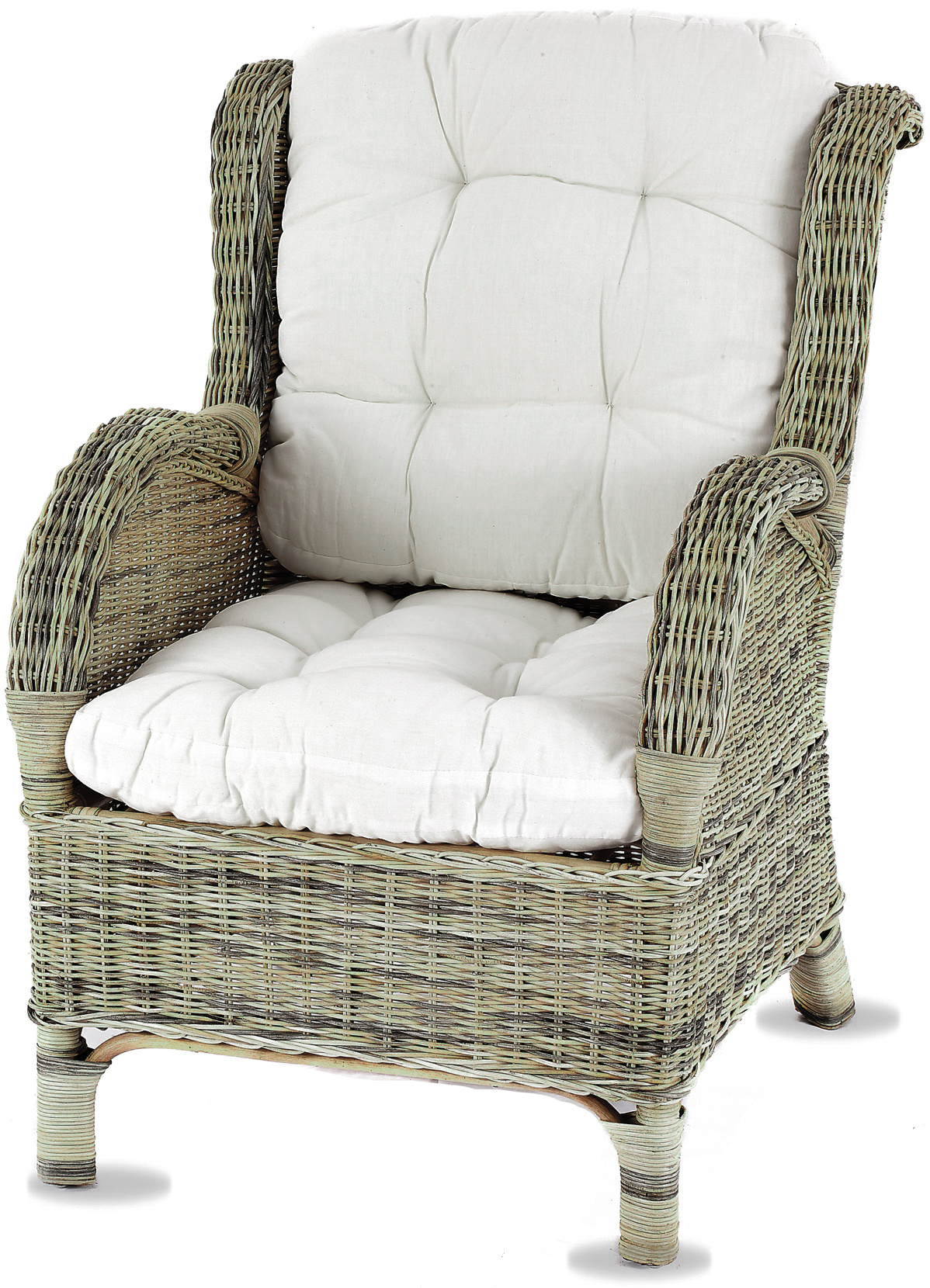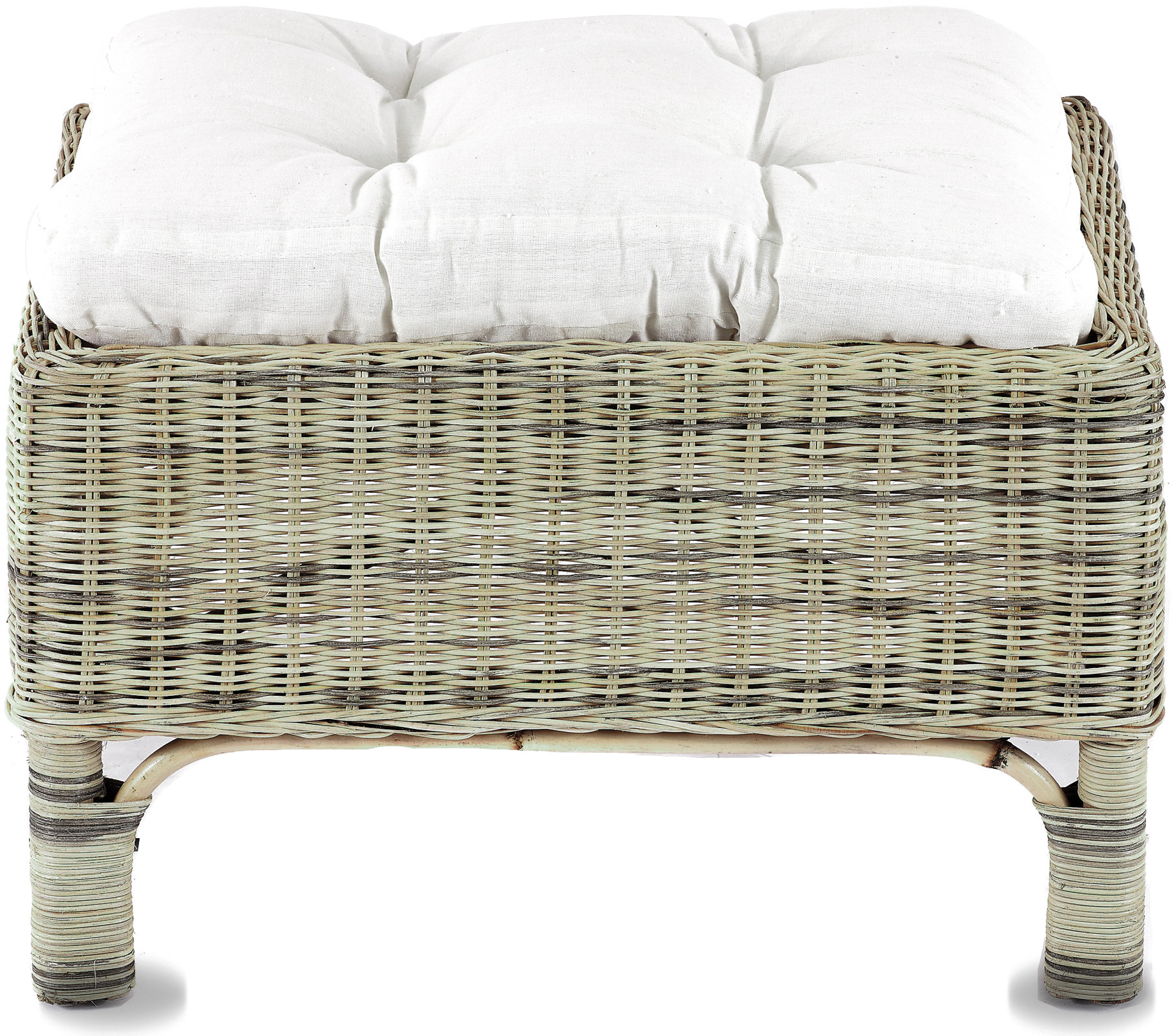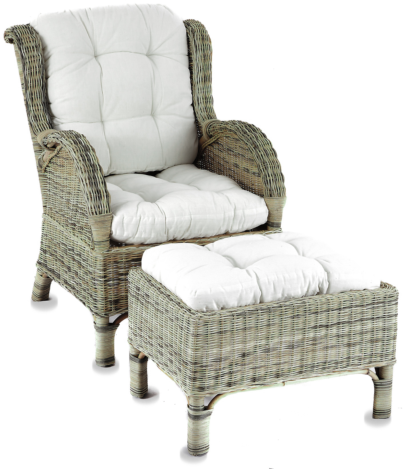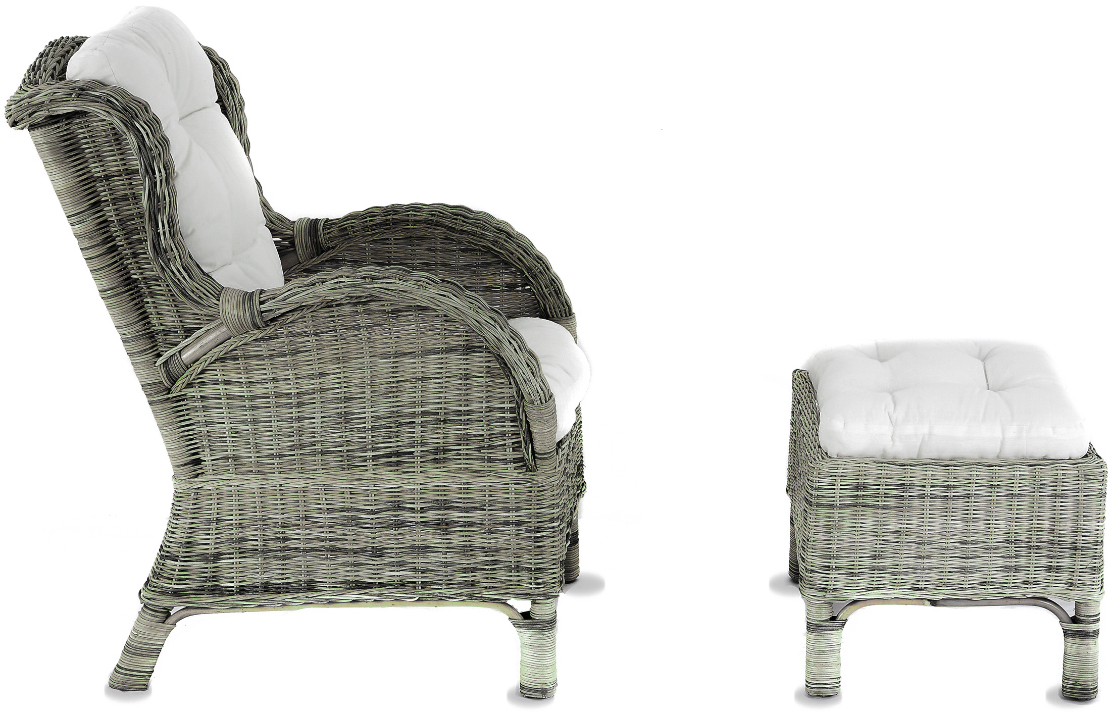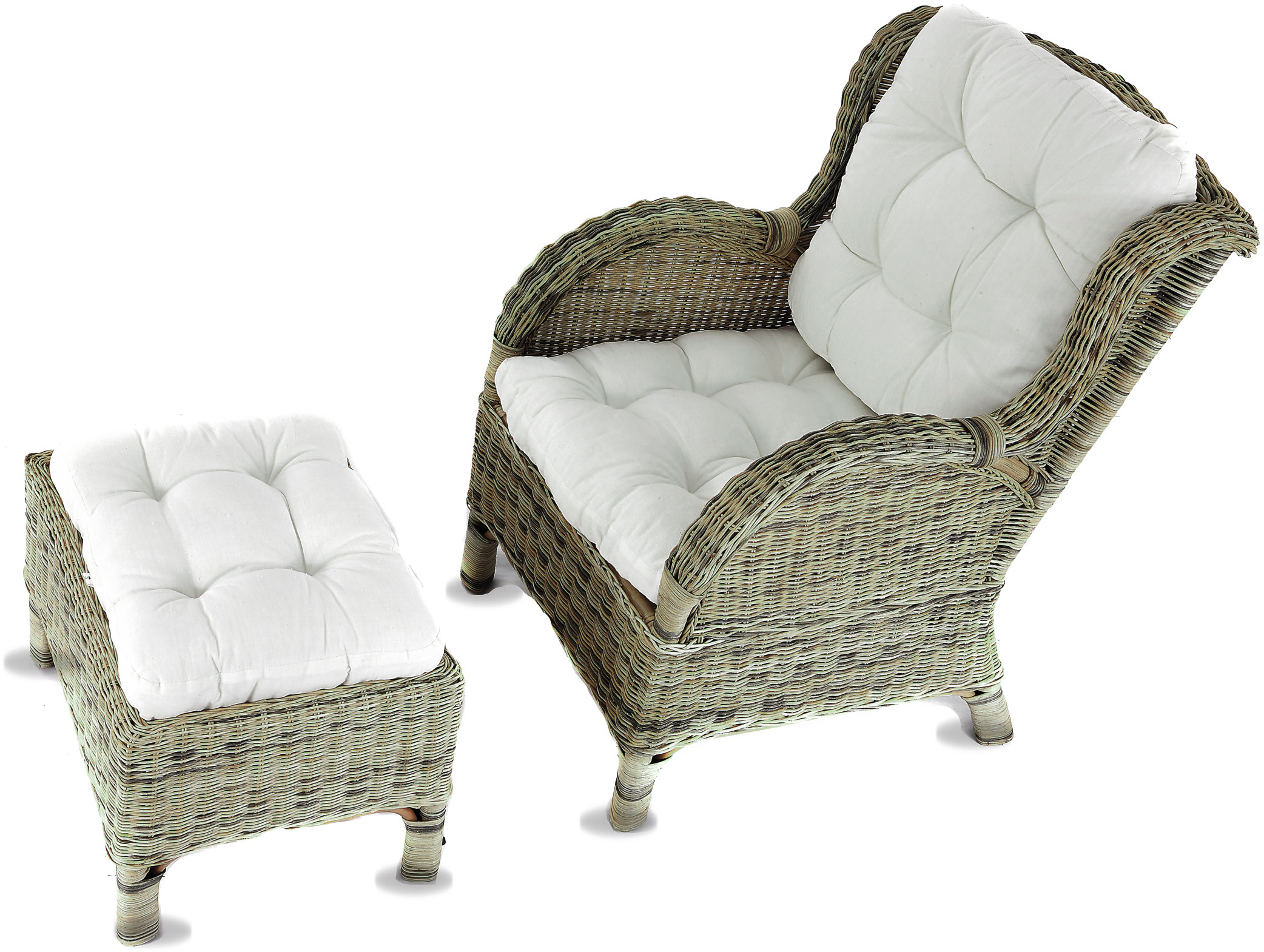 - A készlet tartalmaz egy rattan széket, egy rattan lábtartót és egy teljes párnakészletet