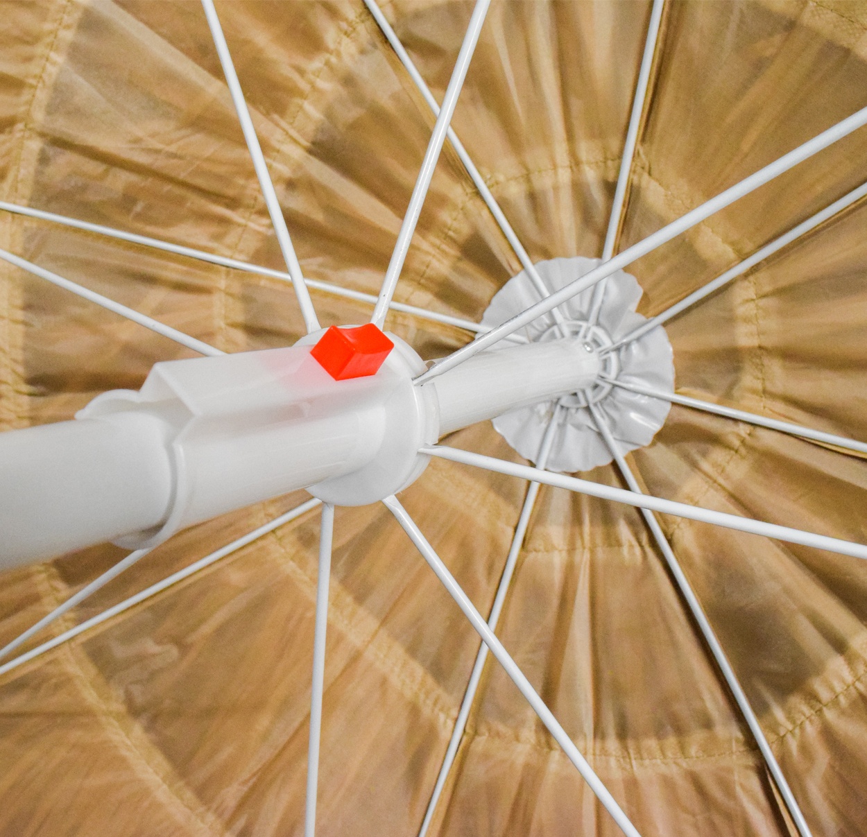 Az ernyő ernyőtetője több réteg polietilén csíkból készül.Szilárd konstrukcióval és minőségi huzattal, amely tartós poliészter anyagból készült.