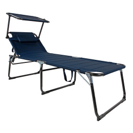 Összecsukható kerti nyugágy napellenzővel, párnázással és megerősített alumínium szerkezettel, modern dizájnnal, alkalmas kertekbe, kempingezéshez vagy strandokra.