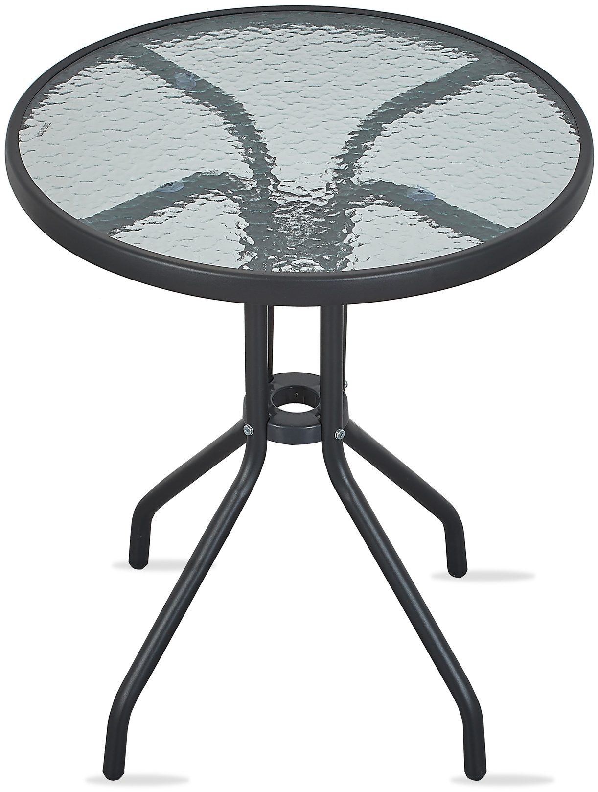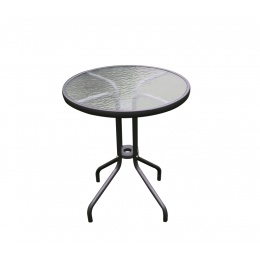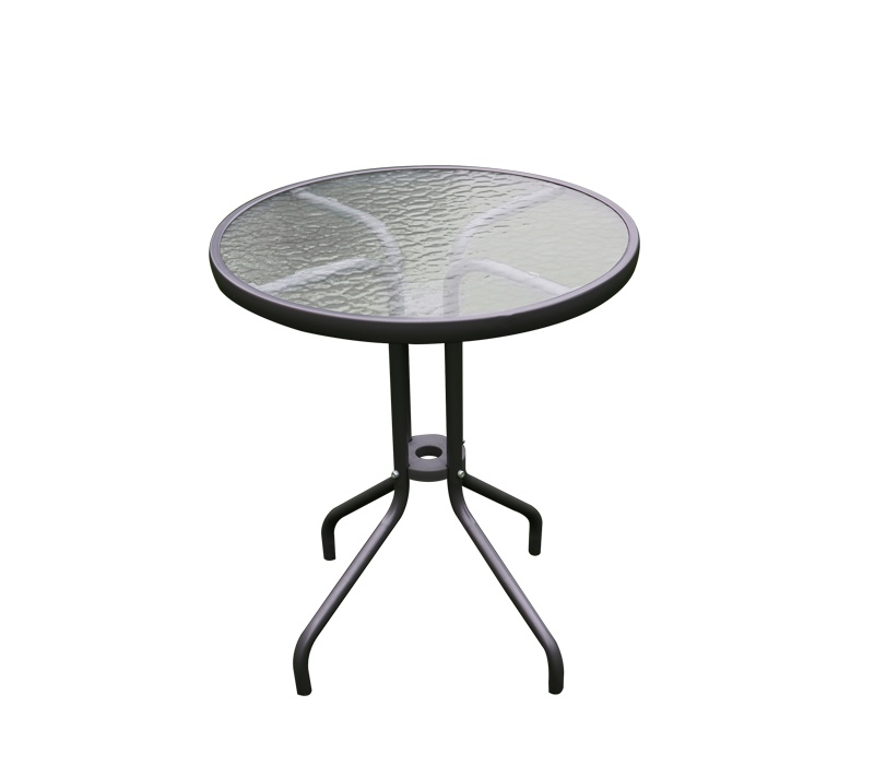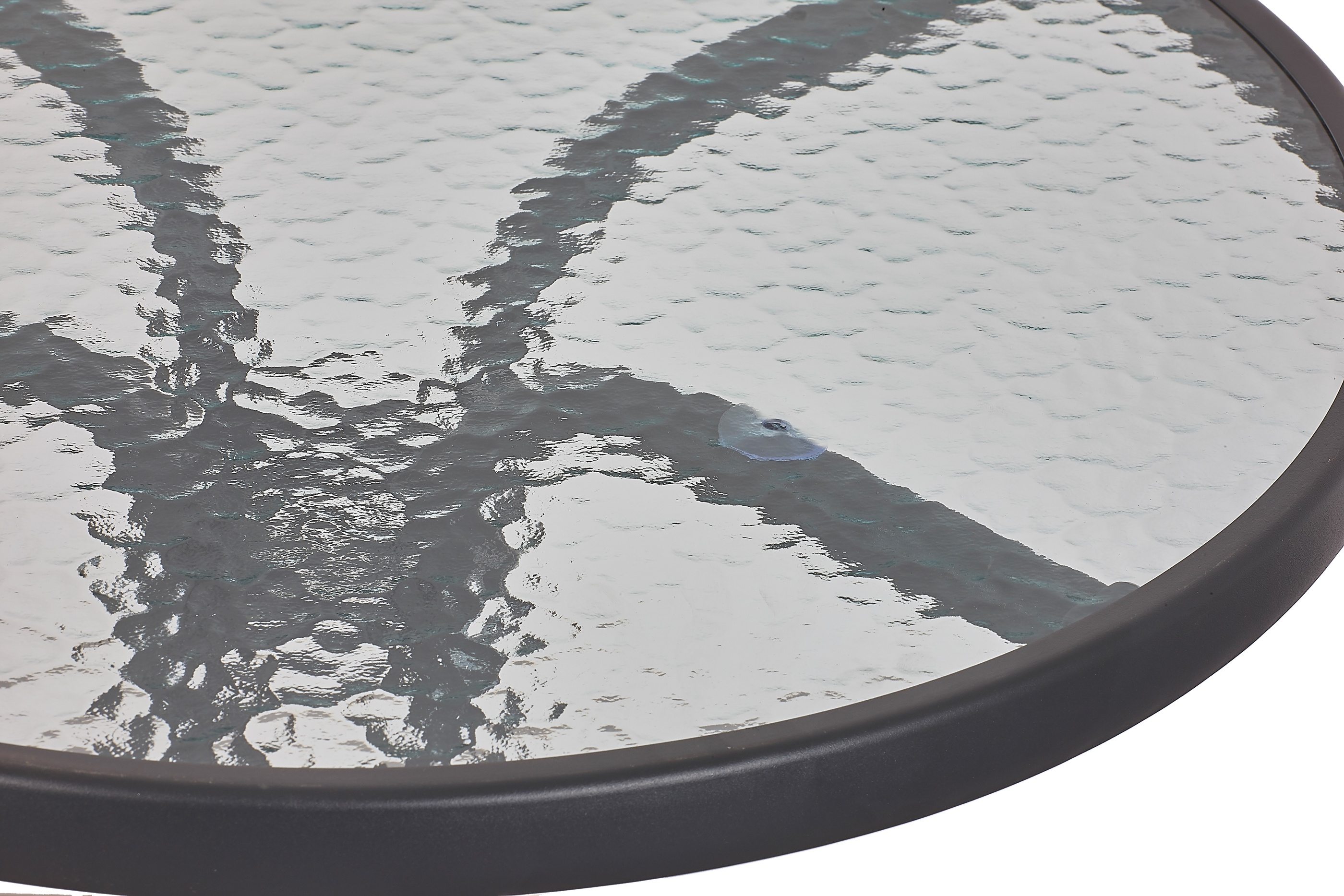 Kerti asztal tömör fémvázzal és recézett üveglappal, modern kialakításban, kertekbe alkalmas, teraszok, kávézók, pavilonok, erkélyek vagy strandok.