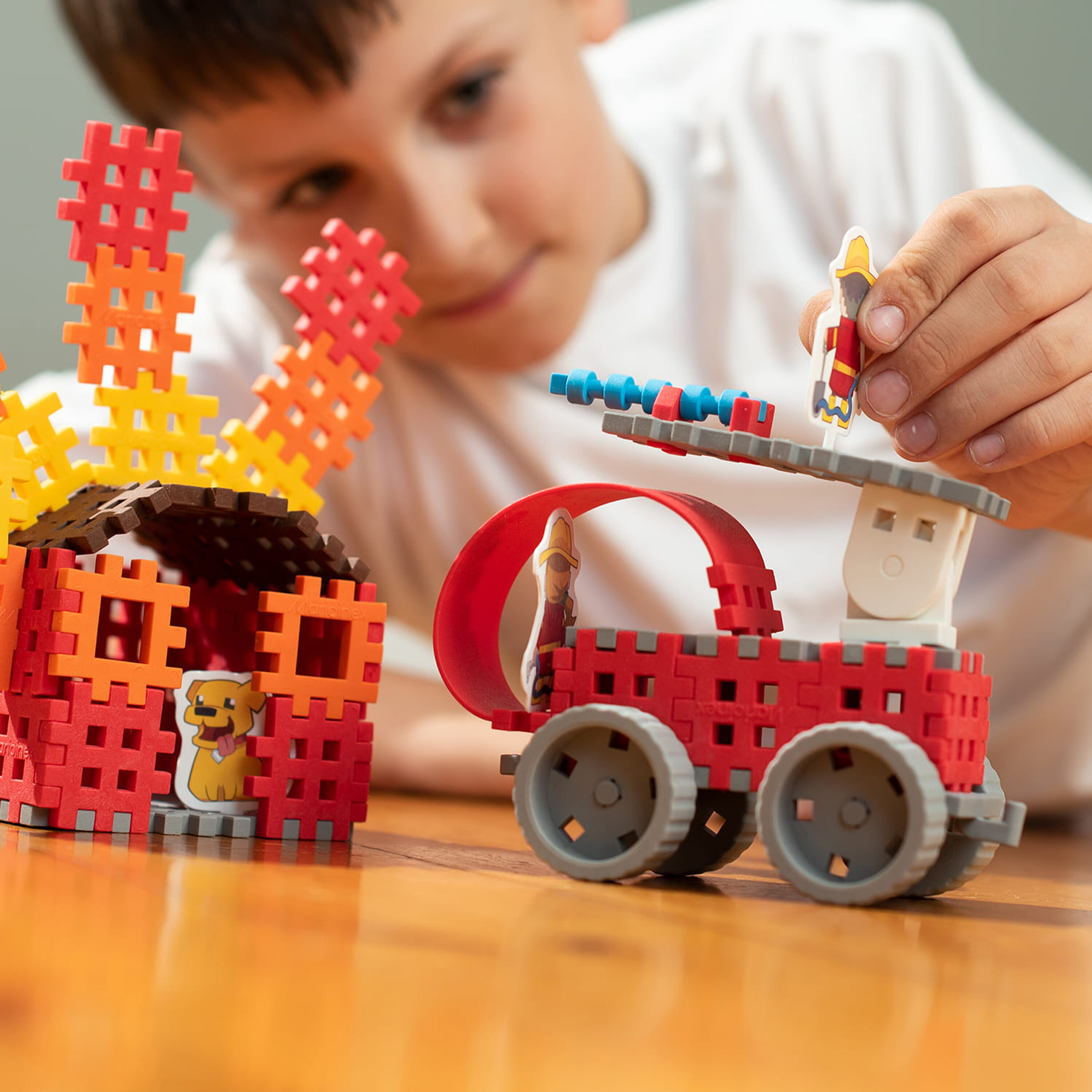 Játék közben a gyermeke felépít egy égő épületet és egy tűzoltóautót.