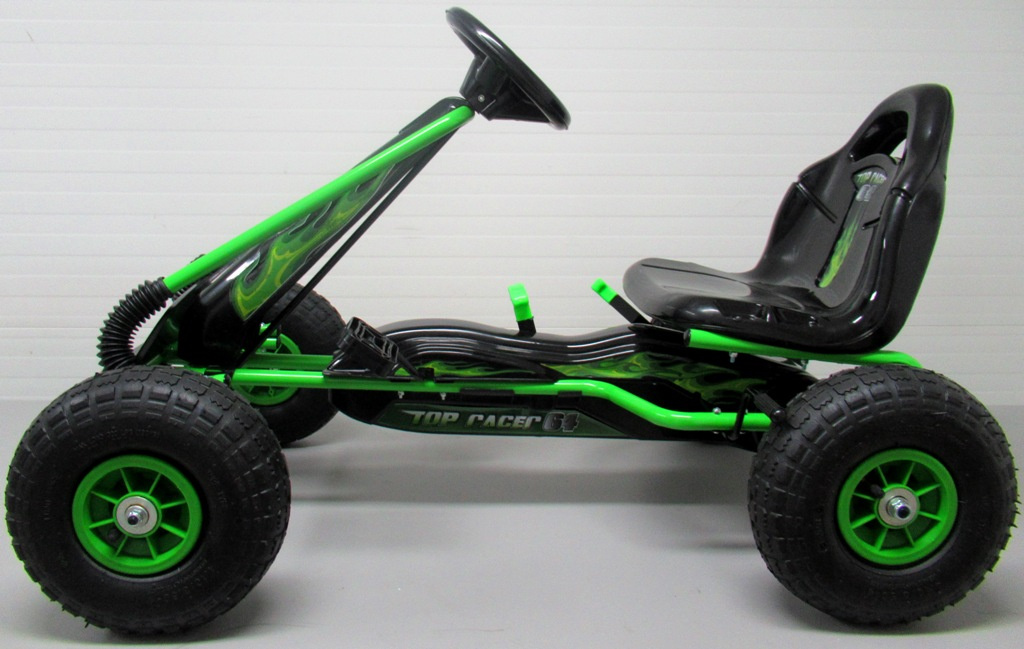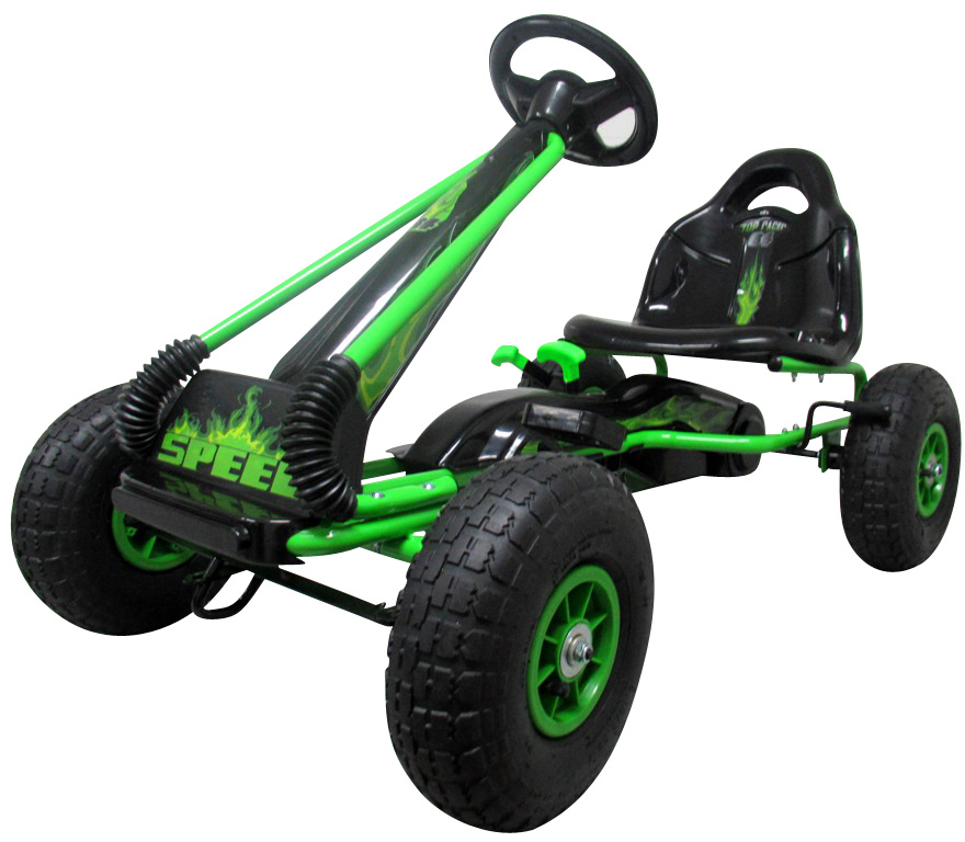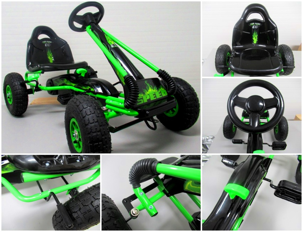 - Széles felfújható kerekek, amelyek tökéletes stabilitást biztosítanak a pedálos járműnek