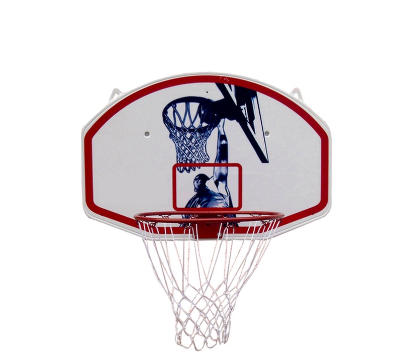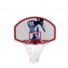 A 45 cm átmérőjű, porszórt acél peremmel és időjárásálló hálóval ellátott kosárlabdapalánk klasszikus piros vonalakkal ellátott hátfalra van szerelve.